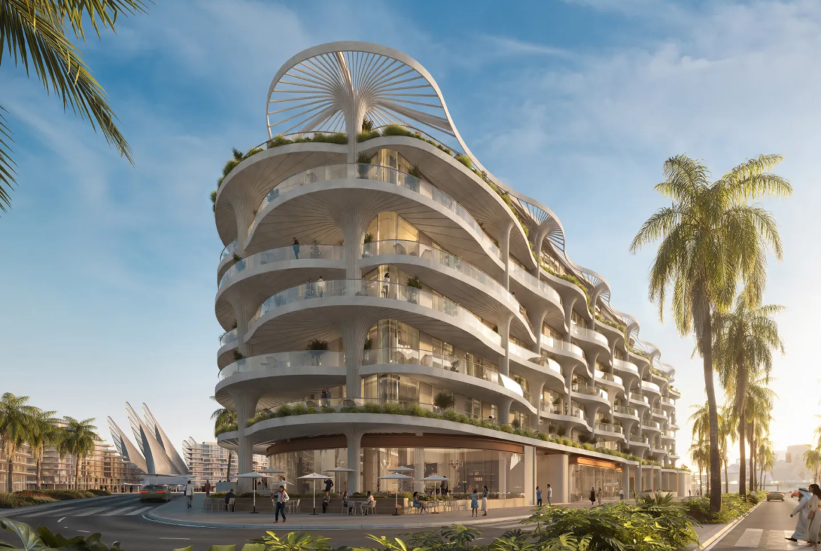 The façade draws its aesthetic and functional essence from nature, with architecture that respects the environment while providing unparalleled luxury. Takada’s signature style flows through the project, bringing the nature-inspired design to each corner of the building. Every curve, every undulating line mimics the forms of a lush forest canopy, bringing a sense of calm to the structure. Low-rise, yet visually captivating, the building seems to grow from the island’s landscape, merging seamlessly with its surroundings. Each residence reflects an atmosphere of serenity, with expansive layouts that invite abundant natural light and frame panoramic views of the nearby Guggenheim Abu Dhabi. The intricate detailing, along with design philosophy, elevates this façade to an exclusive address rooted in the harmony of the natural world.