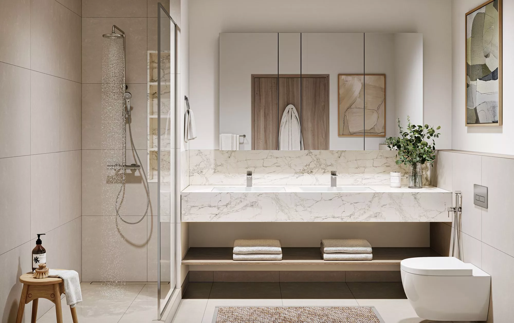 The living area of the properties ranges from 680 sq. ft to 2,011 sq. ft, and each residence will feature 1-2 balconies or a terrace, whilst 3-bedroom layouts will also come with a maid’s room. The design of the interiors will be executed in neutral tones, and complemented with porcelain tiles and laminate shutters with melamine carcasses.